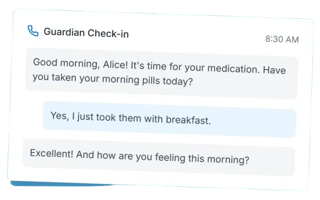 GuardianCall.ai is a voice AI service designed to provide care check-ins. Not a substitute for emergency services.